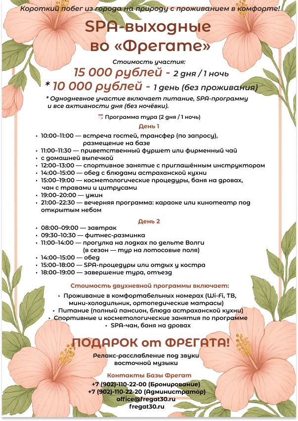 SPA-выходные во "Фрегате" — это короткий побег из города на природу с проживанием в комфорте! Воскресная перезагрузка в компании профессионального фитнес тренера и дипломированного косметолога. Возможность совместить отдых на природе, вдали от шумного города, с водными процедурами и массажем — это отличный подарок себе и близким на праздник или день рождения.